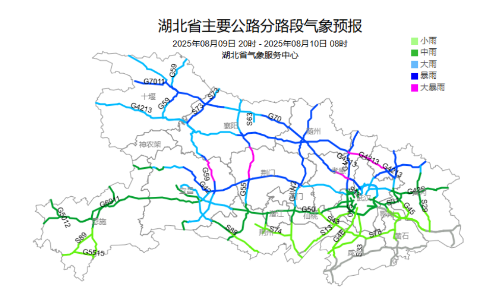 8月9日20时--8月10日8时:十堰、襄阳、随州、孝感、宜昌、荆门北部、武汉北部、黄冈北部等地有大雨到暴雨,局地大暴雨;其他地区多云有阵雨或雷阵雨。湖北省内部分地区伴有短时强降水、雷暴大风等强对流天气。
