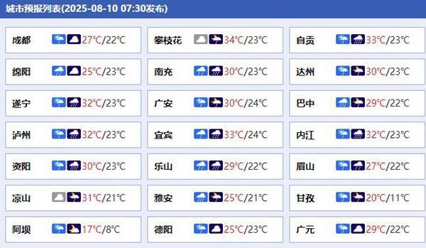 今明两天(8月10日至11日),四川有一次明显降雨过程,其中盆地大部地区强降雨不断,成都、巴中、宜宾等地局部有大暴雨,并伴有强对流天气,公众需注意防范。