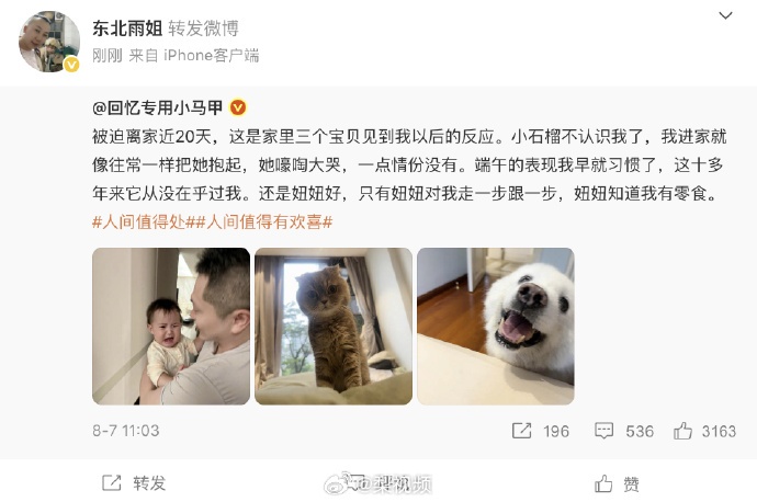8月9日,@东北雨姐 时隔近一年又发博了,她转发了@回忆专用小马甲 一条“家中三个小宝贝”的内容,随后又删除了该内容。