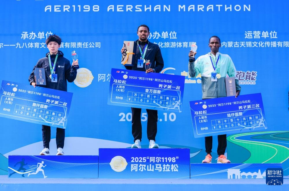 8月10日,亚军中国选手康洋洋、冠军埃塞俄比亚选手阿胡尼姆、季军肯尼亚选手基普图(从左至右)在男子全程马拉松颁奖仪式上。