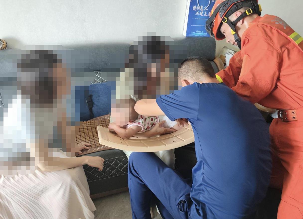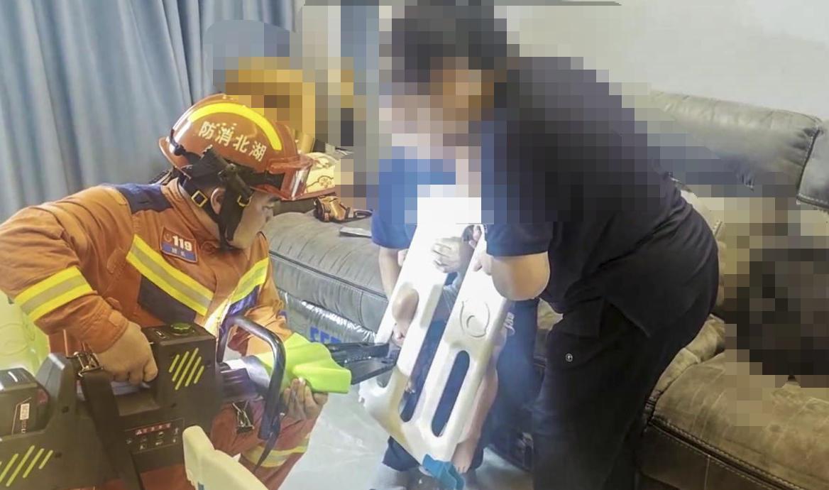 8月6日10时27分,在武汉经济技术开发区沌口路某小区内,一名仅8个月大的幼童不慎将左腿卡入婴儿床护栏缝隙中。消防员到场时发现,塑料护栏已被家长先行拆下,但幼童的左腿膝盖仍被牢牢卡在约5厘米宽的缝隙里。幼童因疼痛哭闹不止,家长在一旁焦急安抚。仔细查看被卡部位后,一名消防员迅速用手套和衣物包裹保护幼童腿部并固定住护栏,另一名消防员则使用剪刀剪开护栏,在剪出一个豁口后,小心翼翼地将护栏掰开,幼童左腿成功脱困。经现场检查,确认并无大碍。
