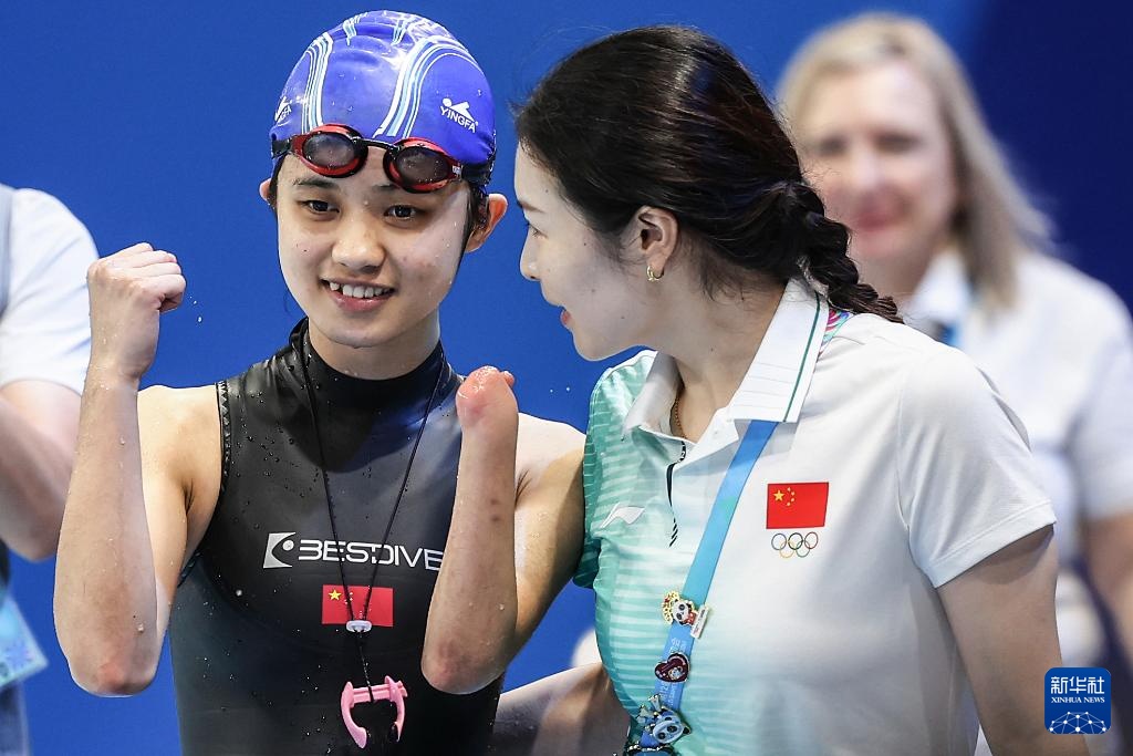 8月10日,中国选手黄诗雨(左)在比赛后庆祝。