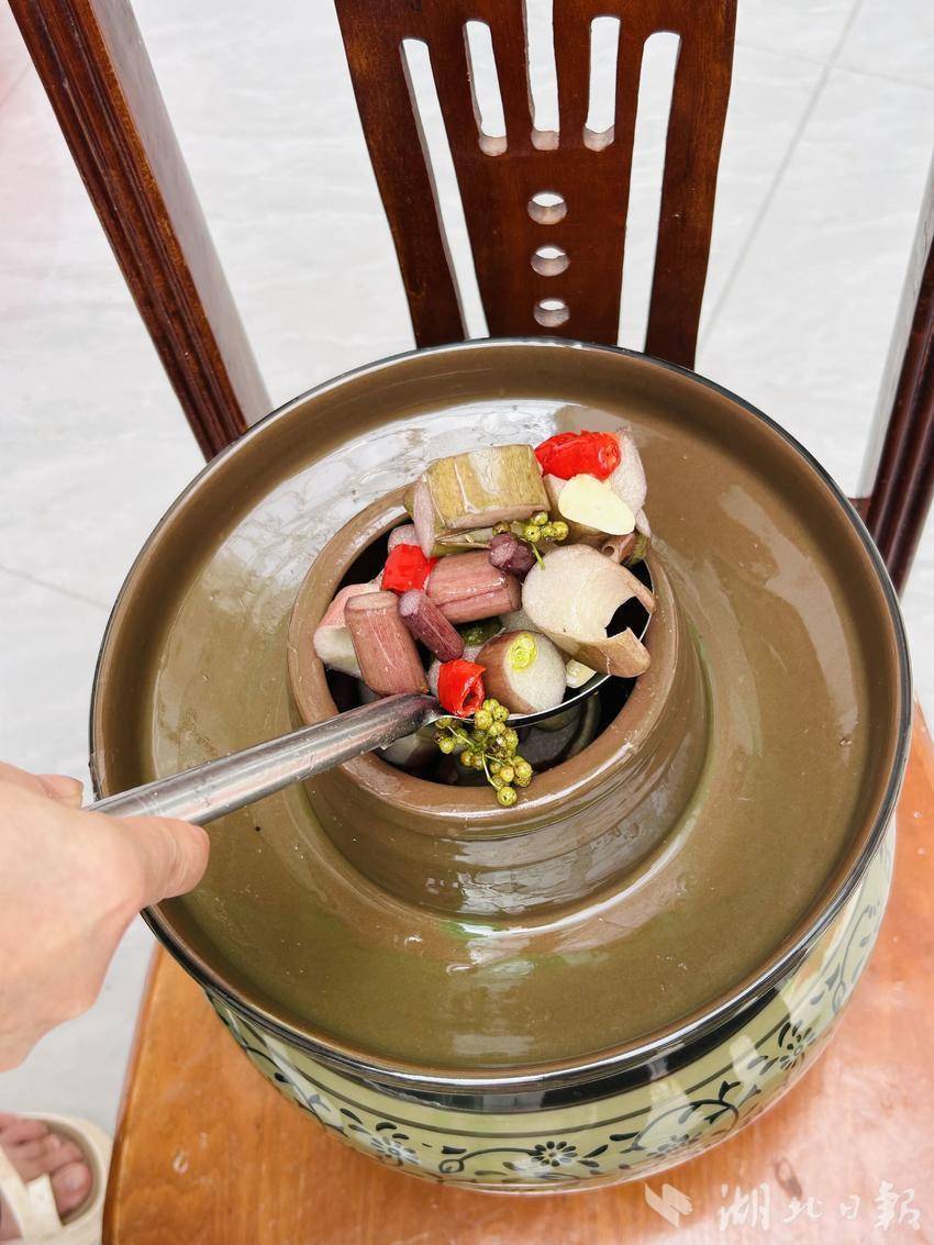 忙活了半天,刘晓芳终于把所有芋荷梗装进坛子里,扣上盖子,加上“坛沿水”,“坛沿水”的作用主要是用来隔绝空气,让芋荷梗在坛子内部充分发酵,让原本青绿的梗茎逐渐变成诱人的红褐色,继而变得酸香扑鼻,令人垂涎欲滴。