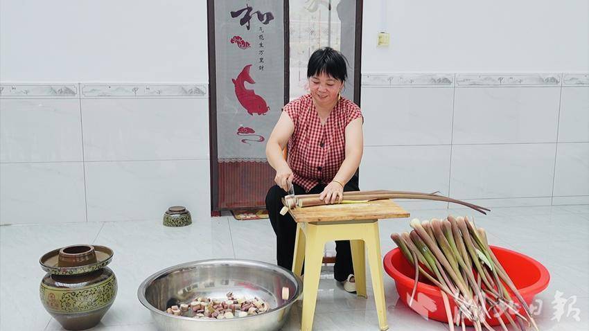 刘晓芳:“我从小就看家里大人腌制芋荷梗,长大后就慢慢学会了。这个时节温度高,一般发酵四到五天就可以了。腌制好的芋荷梗脆爽可口,炒五花肉、干烧、做汤、炒菜,都非常好吃。”