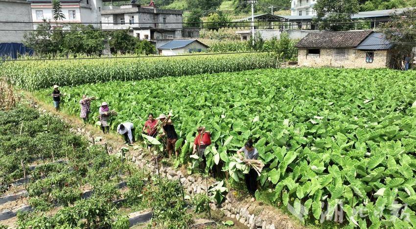 8月6日,盛夏清晨。三里乡三里坝社区居民刘晓芳穿上防水裤,拿着镰刀,和村民们一起来到田边,准备收割芋荷梗。从长势最好的开始收割,只见镰刀轻挥之间,一人高的芋荷梗便顺势倒下。