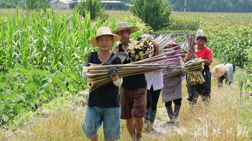 经过一阵忙碌,芋荷梗都采收完毕。将多余的叶子去掉后,大家一人扛着一捆准备回去清洗晾晒。