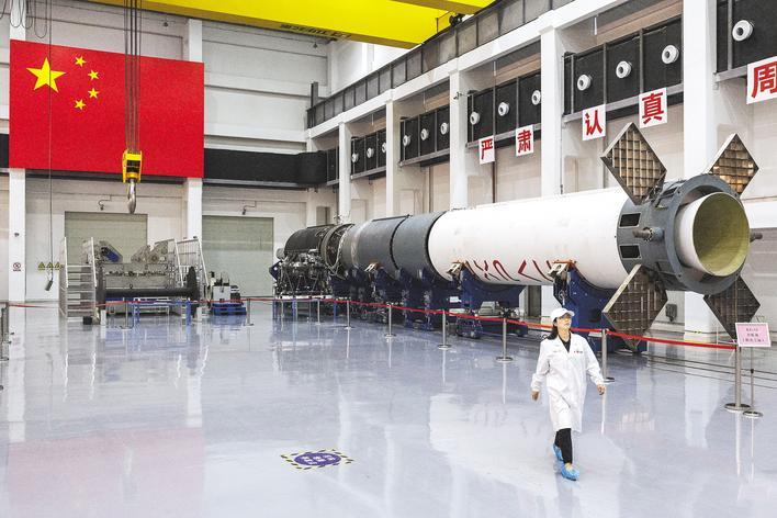 在武汉国家航天产业基地,一名工作人员走在快舟火箭总装厂房内。 (湖北日报全媒记者 任勇 摄)