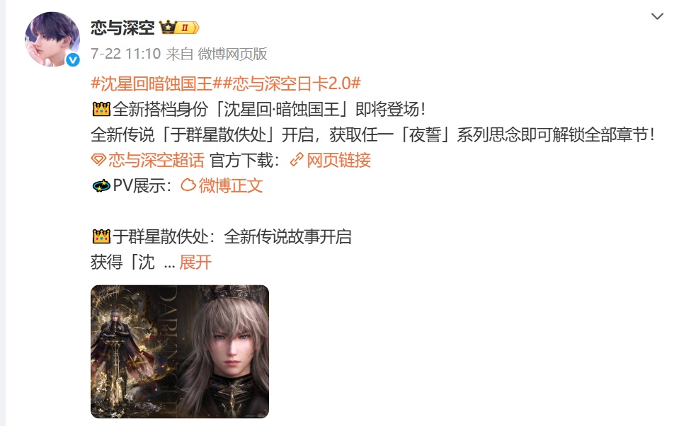 据羊城晚报报道,近日,叠纸游戏旗下热门女性向手游《恋与深空》陷入严重信任危机。2025年7月25日上线的“沉坠的冠冕”活动中,角色“沈星回·暗蚀国王”套装实装效果与宣传PV存在巨大差异,引发玩家不满。