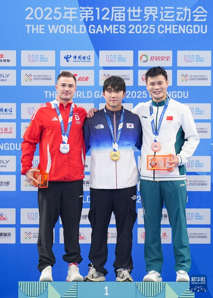 8月11日,冠军韩国选手申明俊(音,中)、亚军德国选手马克斯(左)与季军中国选手张思骞在颁奖仪式上。