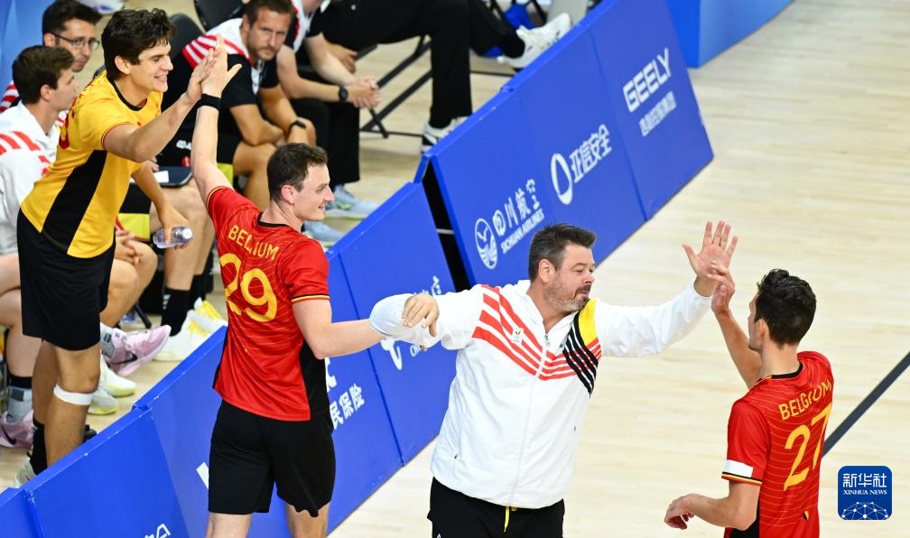 8月11日,比利时队球员与教练在比赛中庆祝得分。
