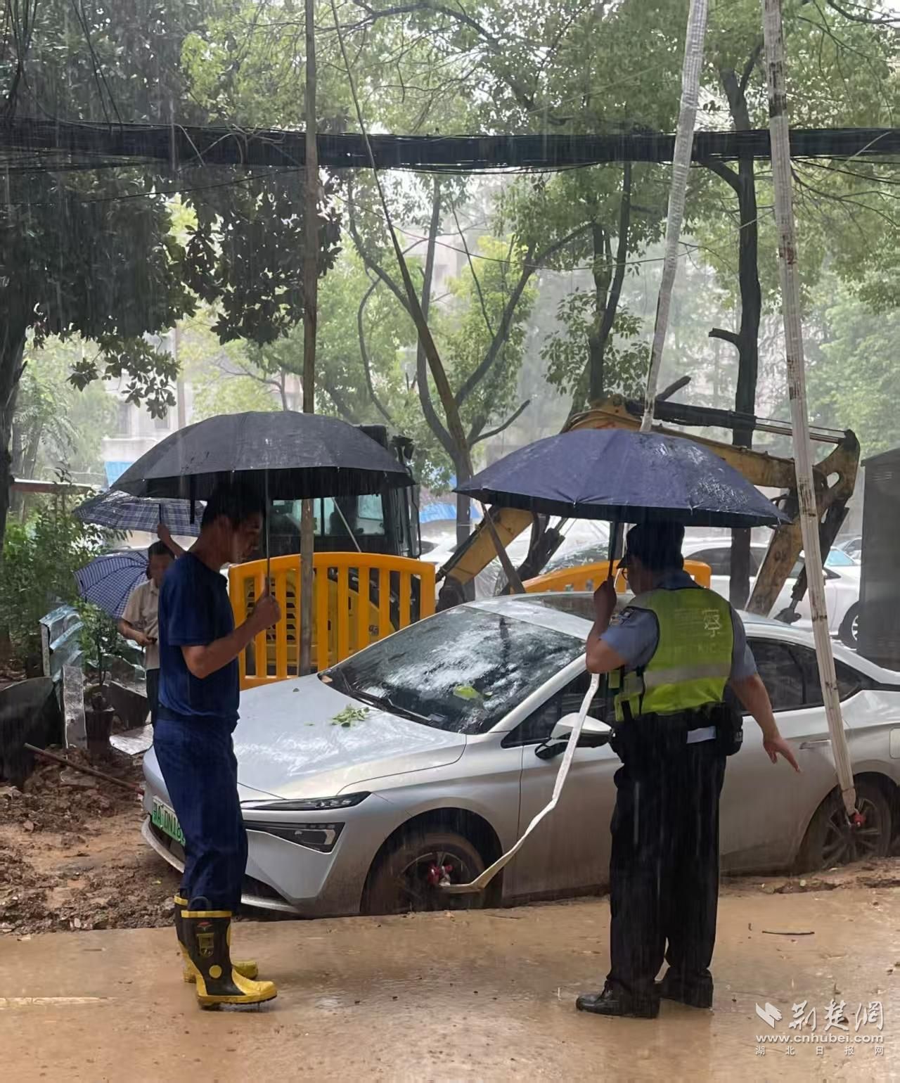 清晨6时许,武昌区市民胡先生发现其停放在工地旁的新能源汽车因降雨深陷泥潭无法移动。在联系多家拖车公司被拒后,胡先生向警方求助。武昌区公安分局第五警务站民警邓长利迅速赶赴现场,经评估风险,紧急协调市政部门调派大型吊车,成功将车辆整体吊离险境。救援结束后,民警督促施工方加固现场围栏并清理路面淤泥,消除后续隐患。