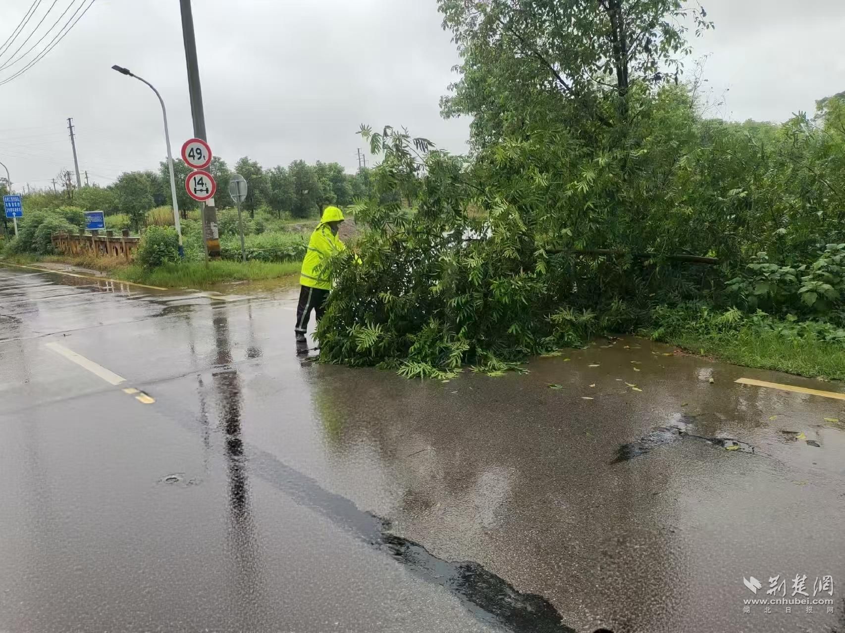 江夏区公安分局辅警清理路面树枝。通讯员供图