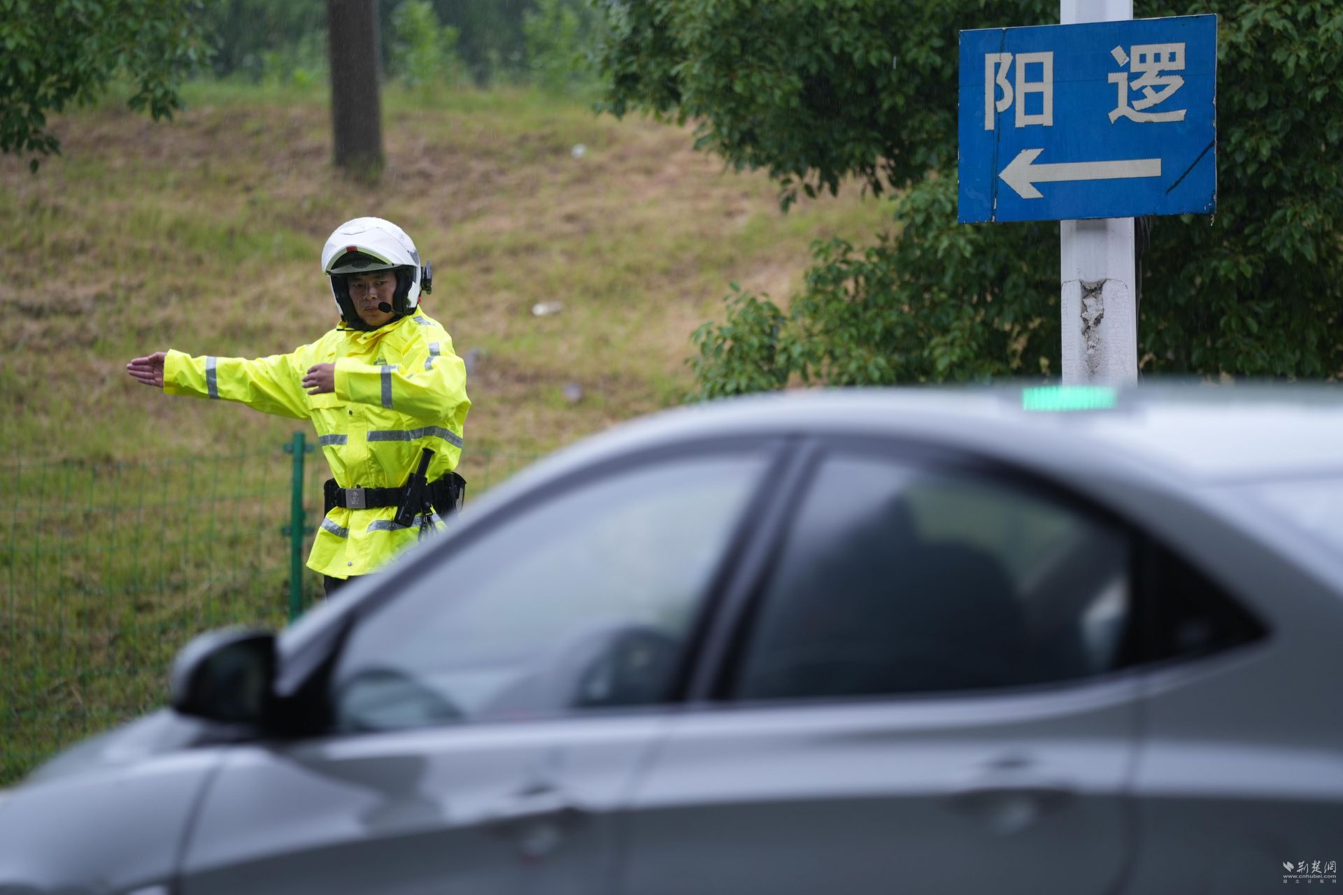 长江新区公安分局交警在雨中疏导交通。通讯员供图