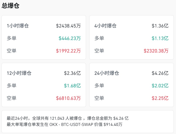 Coinglass数据显示,过去24小时内有超12万人被爆仓,爆仓总金额为4.26亿美元。