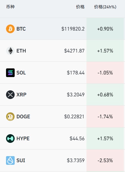 加密货币市场冲高回落,比特币一度涨至12.23万美元,目前跌至12万美元下方,以太坊、SOL、狗狗币等涨跌不一。