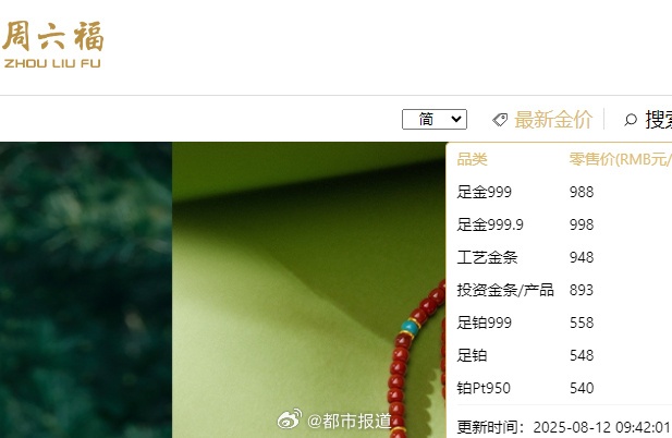 8月12日,记者查询发现,今日周生生金饰品克价跌至1010元,周大福金饰品克价跌至1008元,老庙金饰品克价跌至1004元,周六福金饰品克价跌至988元。
