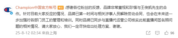 8月12日,“Champion”在@Champion中国官方帐号 留言区发布回应称,品牌非常重视和珍惜与王俊凯的合作,针对目前大家反映的情况,品牌已第一时间与相关涉事人员解除劳动合同,也会在未来进一步加强对各部门员工的管理和培训。同时品牌已同步与直播代运营公司核实此前直播间签名照问题的相关情况。该公司称,将会就此事给出处理方案。