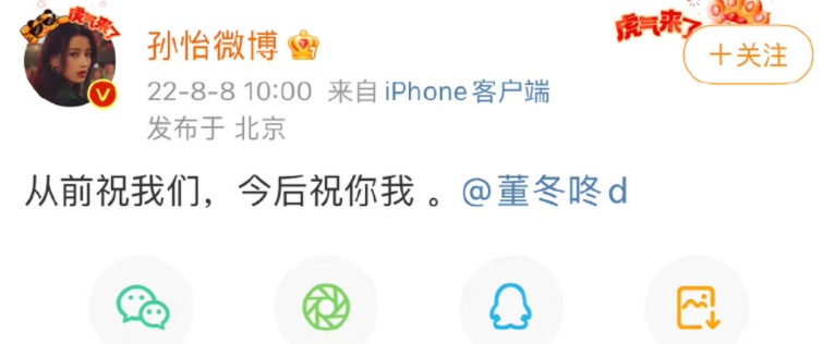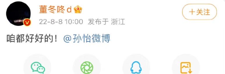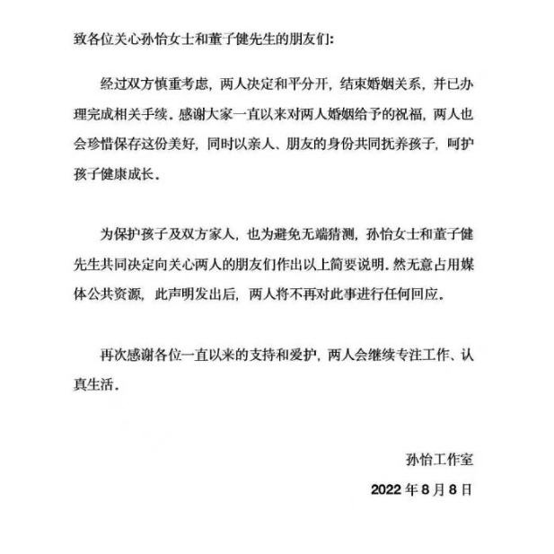 2022年8月8日上午,演员董子健在微博平台发文“咱都好好的”,并@孙怡微博 ,孙怡亦发文“从前祝我们,今后祝你我”,两人官宣离婚。