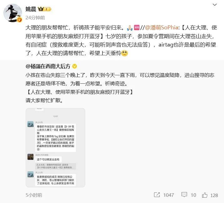 8月12日,演员姚晨转发相关微博为其发声求助:大理的朋友帮帮忙,祈祷孩子能平安归来。