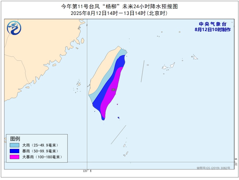 降水预报:8月12日14时至13日14时,台湾岛东部和南部将有大到暴雨,其中台湾岛东部的部分地区有大暴雨(100~180毫米)。