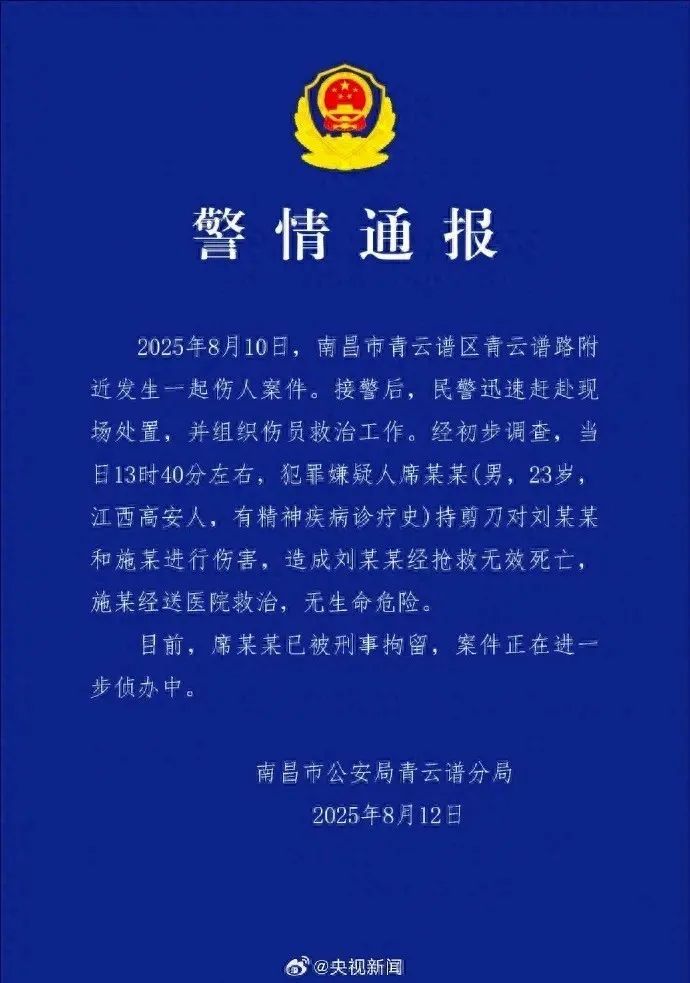 8月12日,南昌市青云谱区警方通报了两天前发生在当地景区的一起命案。犯罪嫌疑人席某某持剪刀行凶,导致1死1伤。记者了解到,遇害者刘某某是外交学院的大一女生。