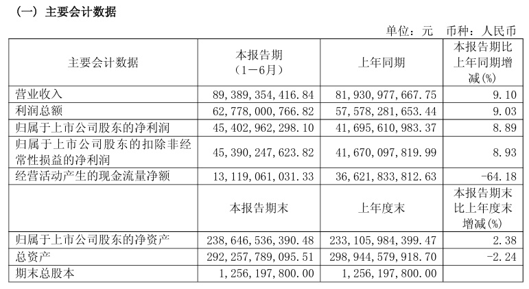 8月12日晚间,贵州茅台酒股份有限公司(贵州茅台,600519.SH)披露2025年半年度报告,报告期内,公司营业总收入910.94亿元,同比增长9.16%;实现营业收入893.89亿元,同比增长9.10%;归属于上市公司股东的净利润454.03亿元,同比增长8.89%。