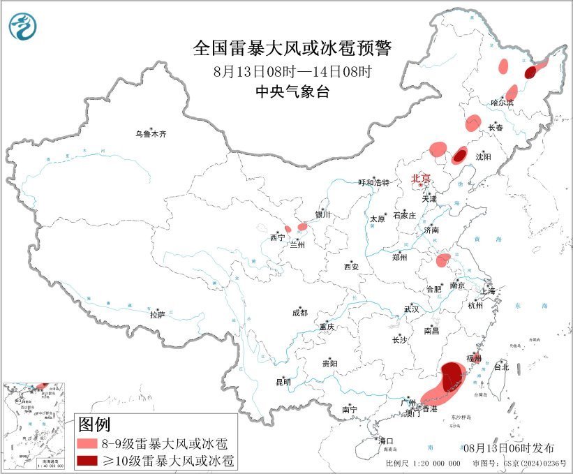 预计8月13日08时至14日08时,内蒙古东南部、东北地区北部和西部、苏皖北部、华南东部等地的部分地区将有8级以上雷暴大风或冰雹天气,其中,黑龙江东北部、辽宁西部、福建南部、广东东部等地的部分地区将有10级以上雷暴大风,最大风力可达11级以上;内蒙古东南部、东北地区北部和西部、江淮西部和北部、江汉、江南北部和西部、西南地区东部和南部、华南等地的部分地区将有小时雨量大于20毫米的短时强降水天气,其中,福建南部、广东东部等地的部分地区小时雨量大于50毫米,最大可达70毫米以上。