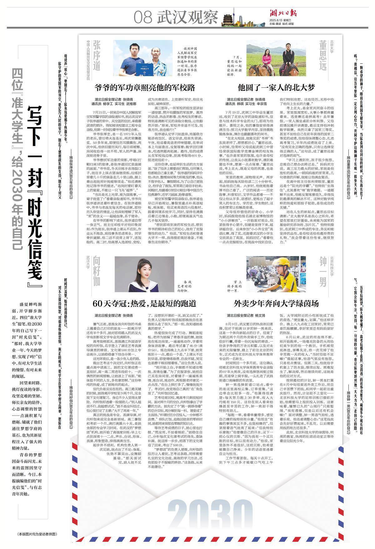 盛夏蝉鸣渐弱,开学脚步渐近。四位“准大学生”提笔,给2030年的自己写下一封“时光信笺”。“那时,我大学毕业一年,今天的梦想,实现了吗?”信中,有对大学生活的憧憬,有对未来的规划。