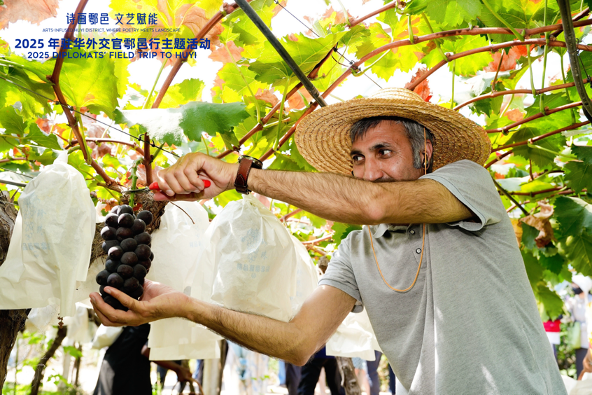 巴基斯坦伊斯兰共和国驻华科技参赞可汗·穆罕穆德正在采摘成熟的葡萄