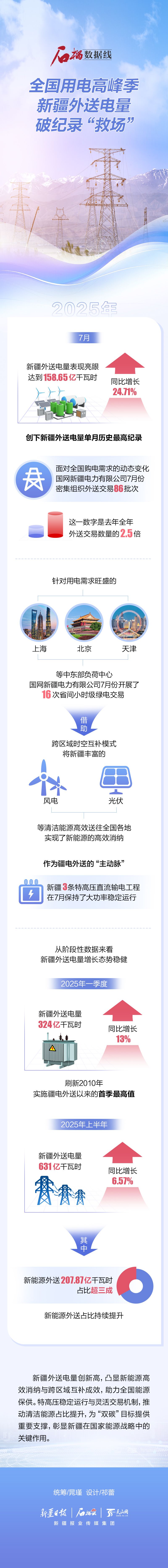 7月新疆外送电量表现亮眼,达到158.65亿千瓦时,同比增长24.71%,创下新疆外送电量单月历史最高纪录。