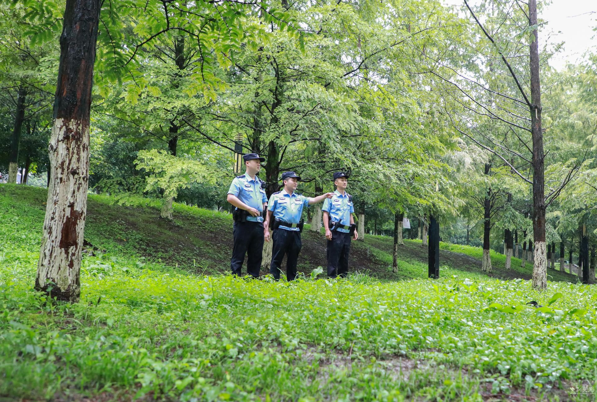 利川市公安局东城派出所民警辅警巡逻保护水杉林。通讯员供图