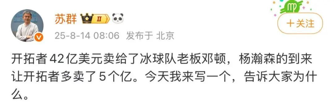 国内篮球名嘴苏群表示:“开拓者42亿美元卖给了冰球队老板邓顿,杨瀚森的到来让开拓者多卖了5个亿。”