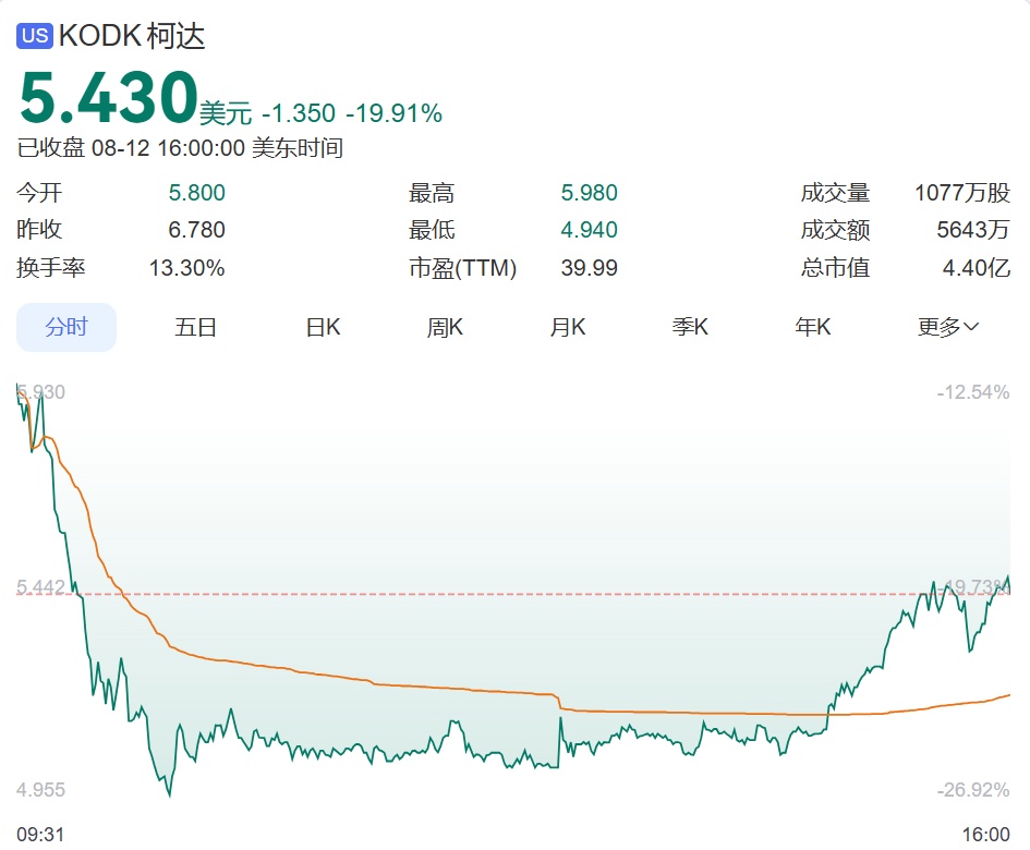 受此消息影响,当地时间12日,柯达股价一度跌超26%,截至收盘跌19.91%。