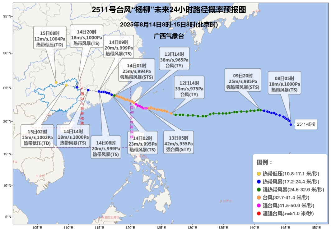 广西气象台透露,预计台风“杨柳”14日夜间将以热带低压强度从全州到富川一带进入广西。