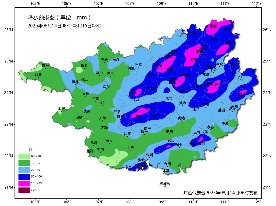 预计,8月14日20时至15日20时,湖南西部和南部、贵州、重庆东南部、广东中西部、广西等地部分地区有大到暴雨,其中,湖南南部、广西中北部和南部沿海、广东西南部等地部分地区有大暴雨,广西东北部等地局地特大暴雨(250~260毫米)。