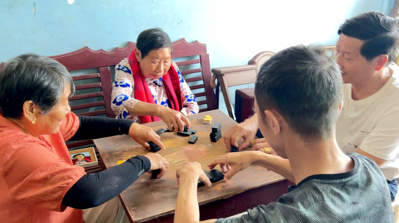 在谷贞村黄土垴三组,105岁的刘冬霞一头黑发、耳聪目明,正和子女围坐桌前玩骨牌,指尖灵活翻动着牌面。