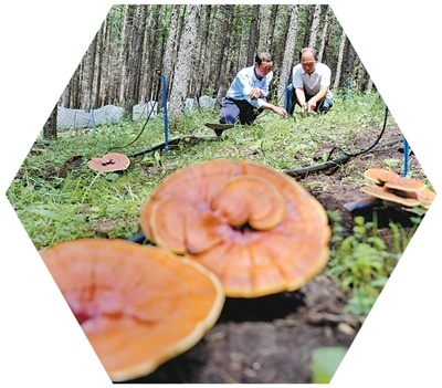 河北省围场满族蒙古族自治县哈里哈镇八十三号村,基地工作人员正查看灵芝长势。王立群摄