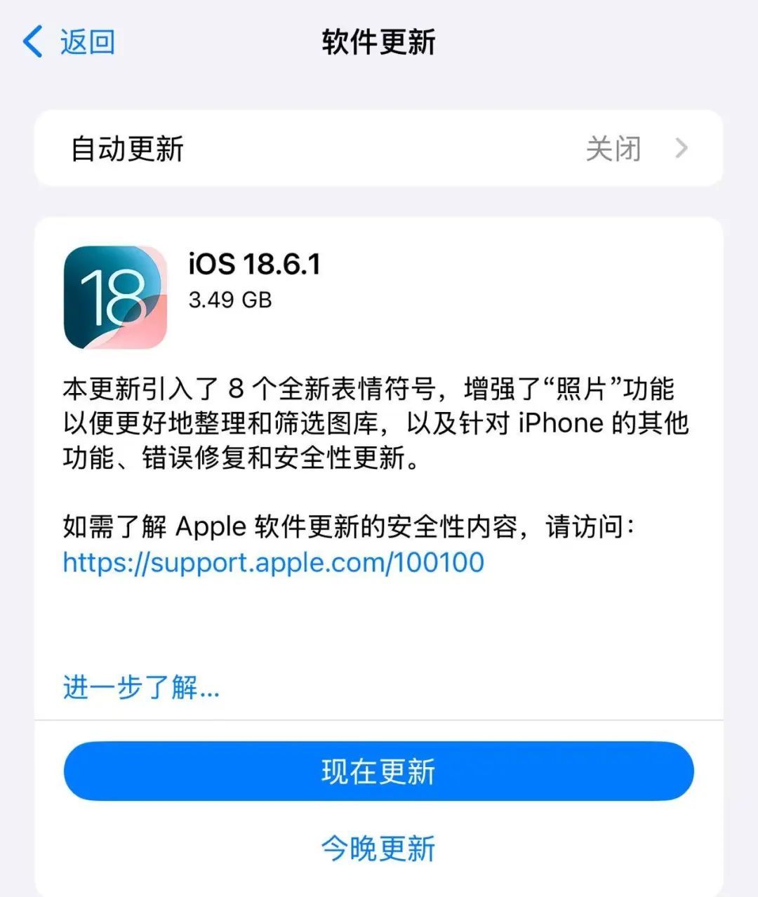 苹果公司8月15日面向 iPhone 用户,推出了iOS 18.6.1 更新,在修复诸多错误、提升安全性之外,本次更新主要引入了8个全新表情符号,增强了“照片”功能。
