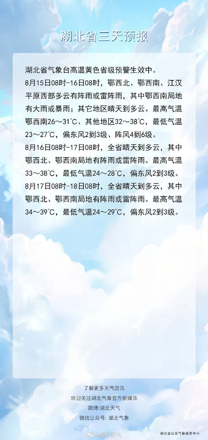 湖北省气象台高温黄色省级预警生效中,中东部地区最高气温将升至35℃以上,其中武汉、鄂州、黄冈、黄石、咸宁局地可达37℃以上。明后天雨水渐止,全省晴天到多云,仅鄂西局地有阵雨出没。气温进一步走高,大部地区最高气温明天33~38℃,后天34~39℃。