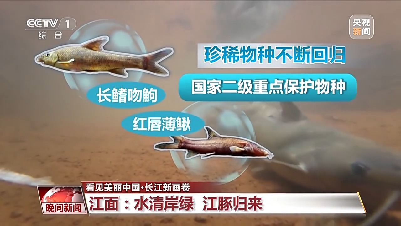 如今,最新监测到长江江豚种群已达1249头,比5年前增长了200多头。重新回到长江家园的不只是江豚,长江物种多样性水平在稳步回升,2021年至2024年,长江流域累计监测到土著鱼类344种,比禁渔前2017年至2020年增加了36种。