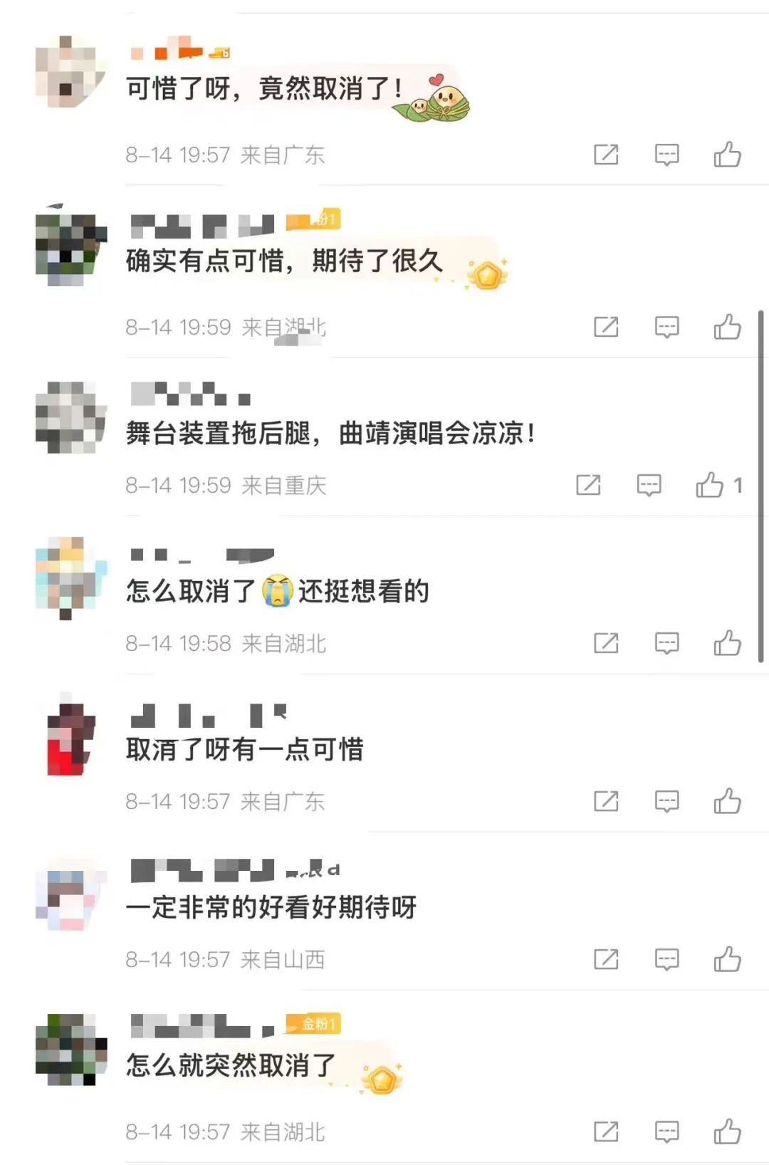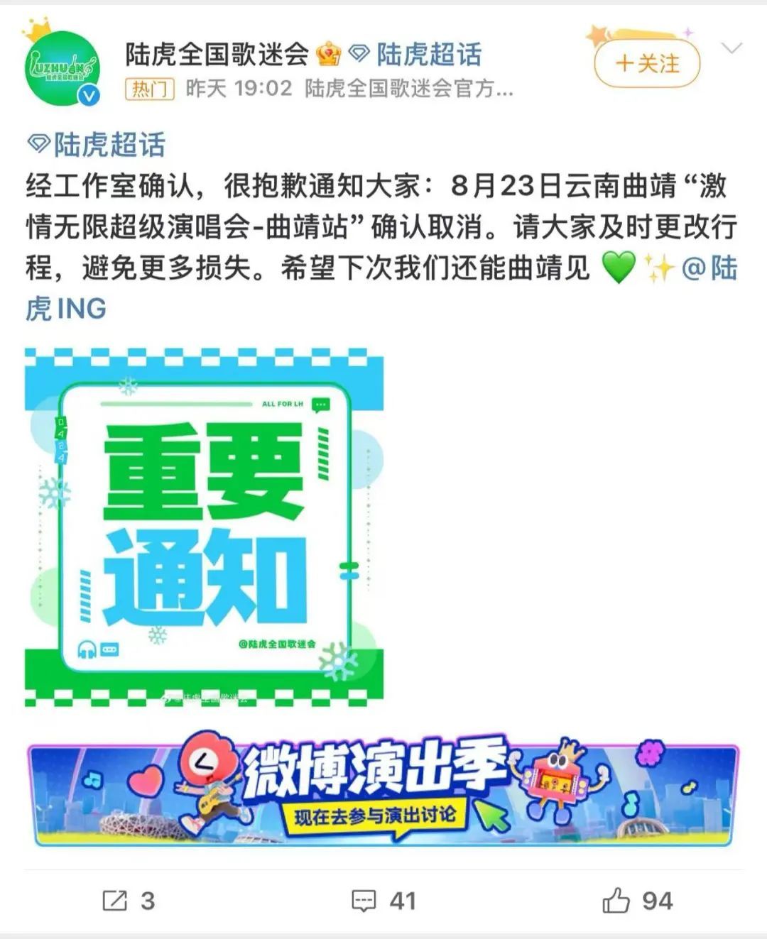 因本次演唱会涉及多个舞台道具及舞美装置的安装工作,无法达到演出要求,不能完全保证最佳表演效果,为保障歌迷朋友们的观演体验,经慎重研究,原定于2025年8月23日在曲靖市文化体育公园体育场举办的“激情无限超级演唱会-曲靖站”取消举办。