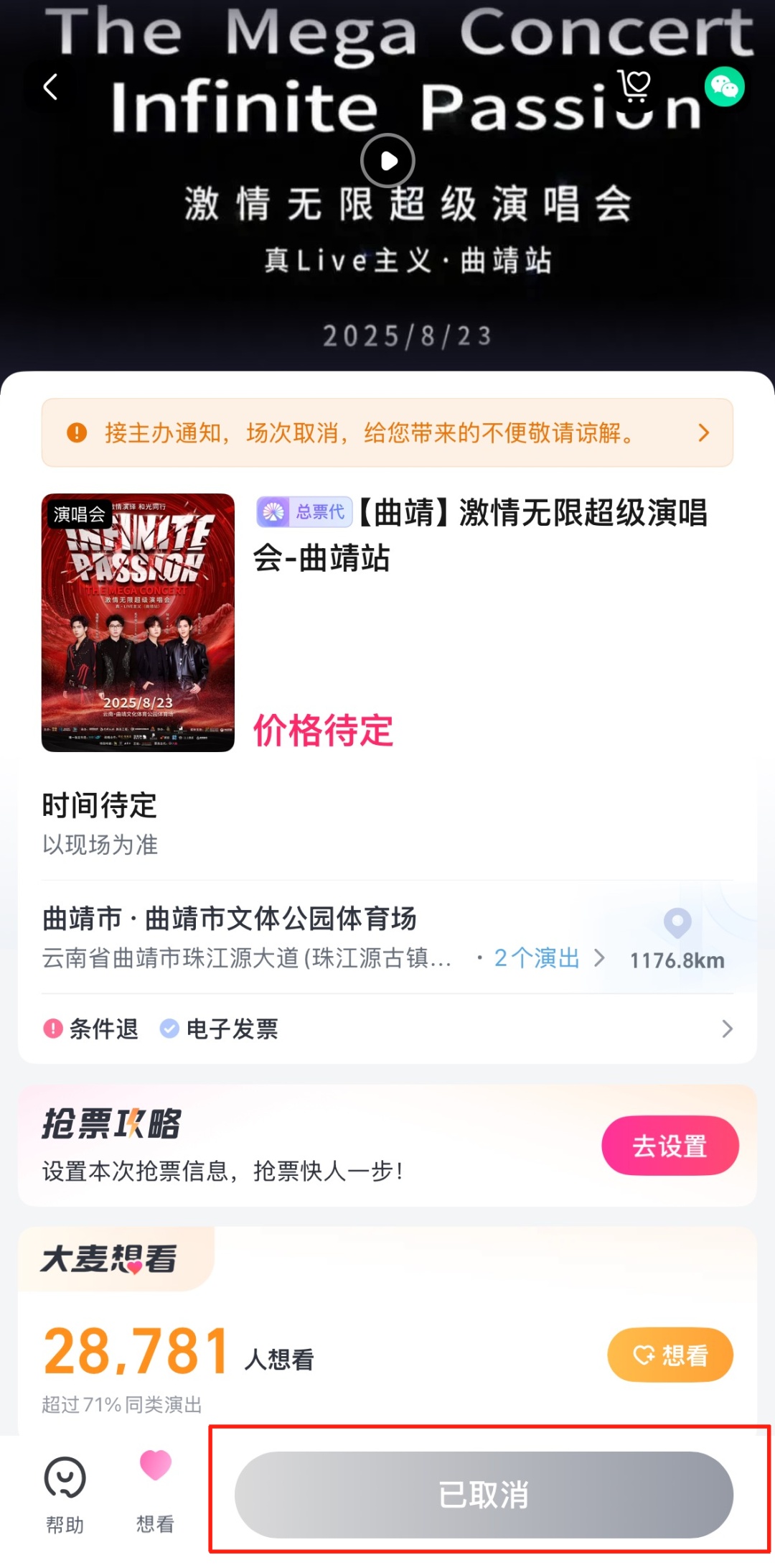 8月14日,大麦官方发布演出取消公告,因多个舞台道具及舞美装置的安装工作未达要求,取消原定于8月23日在曲靖市文化体育公园体育场举办的“激情无限超级演唱会”。