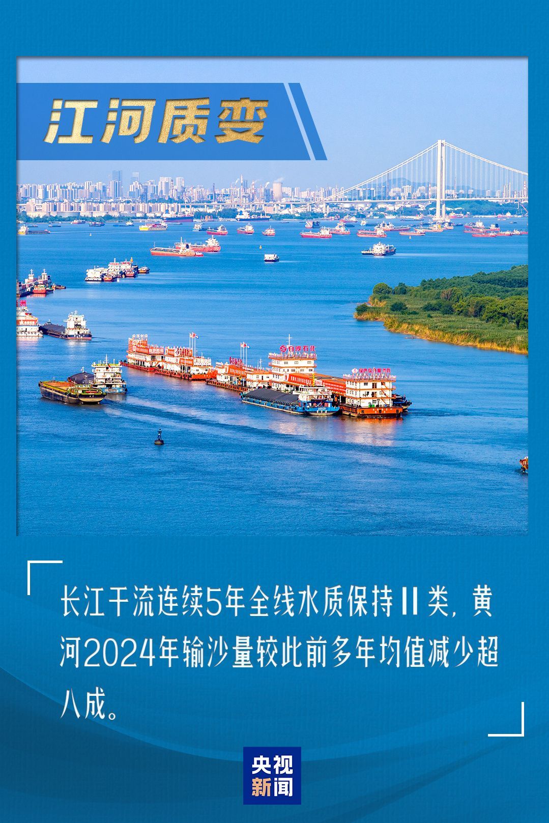 长江、黄河是中华民族的母亲河,孕育了源远流长的华夏文明。近年来,通过实施一系列重要举措,长江、黄河的生态保护治理取得显著成效,母亲河重现生机、活力。最新数据显示,长江干流连续5年全线水质保持Ⅱ类;黄河2024年输沙量较此前多年均值减少超八成。