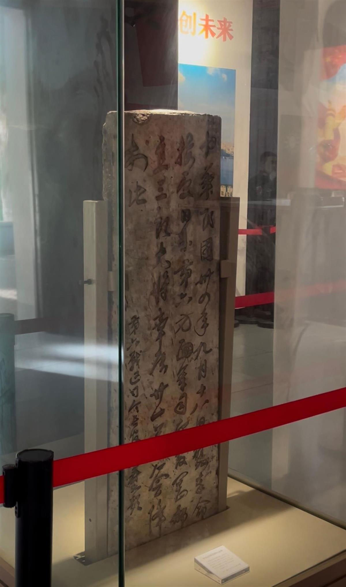 玻璃柜中的原碑高1.30米,碑身清晰刻着“受降纪念碑”几个字,孙蔚如将军手书的“中华民国三十四年(1945年)九月十八日,蔚如奉命接受日本第六方面军司令官冈部直三郎大将率属二十一万签降于此——第六战区司令官孙蔚如题”。字迹清晰流畅,刚劲有力。