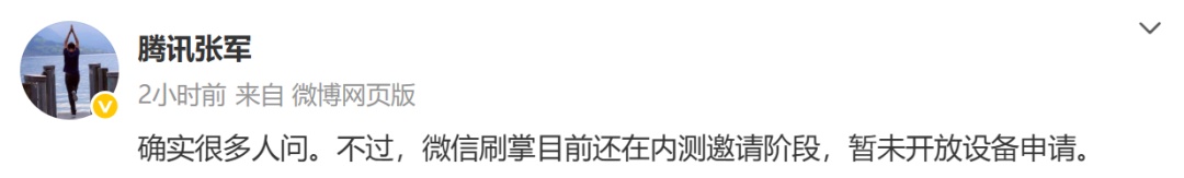 8月15日消息,微信支付智慧生活公众号今日发文回应刷掌设备申请:微信刷掌目前还在内测邀请阶段,暂未开放设备申请。
