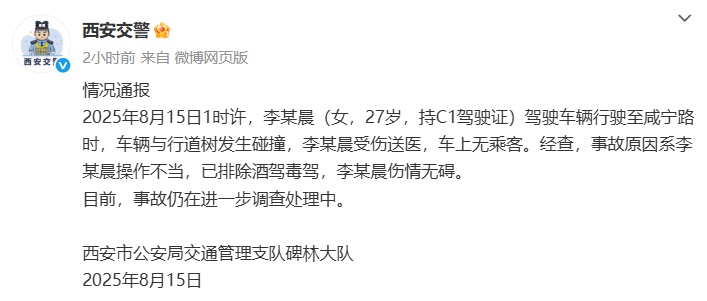 2025年8月15日1时许,李某晨(女,27岁,持C1驾驶证)驾驶车辆行驶至咸宁路时,车辆与行道树发生碰撞,李某晨受伤送医,车上无乘客。经查,事故原因系李某晨操作不当,已排除酒驾毒驾,李某晨伤情无碍。