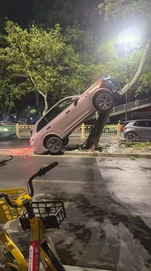 8月15日,多位网友发视频称西安一辆新能源车开上了路中间的绿化带并架在树上。