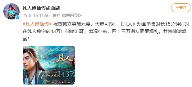 中午,@凡人修仙传动画剧 发文:祝贺韩立突破元婴,大道可期!《凡人》动画单集时长15分钟同时在线人数突破43万!仙缘汇聚,盛况空前,四十三万道友同屏观礼,共贺仙途盛宴!
