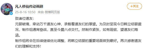 制作组将会在后续继续优化调整,将韩立结婴的重要场面做到最好。再次感谢道友们的理解和支持!