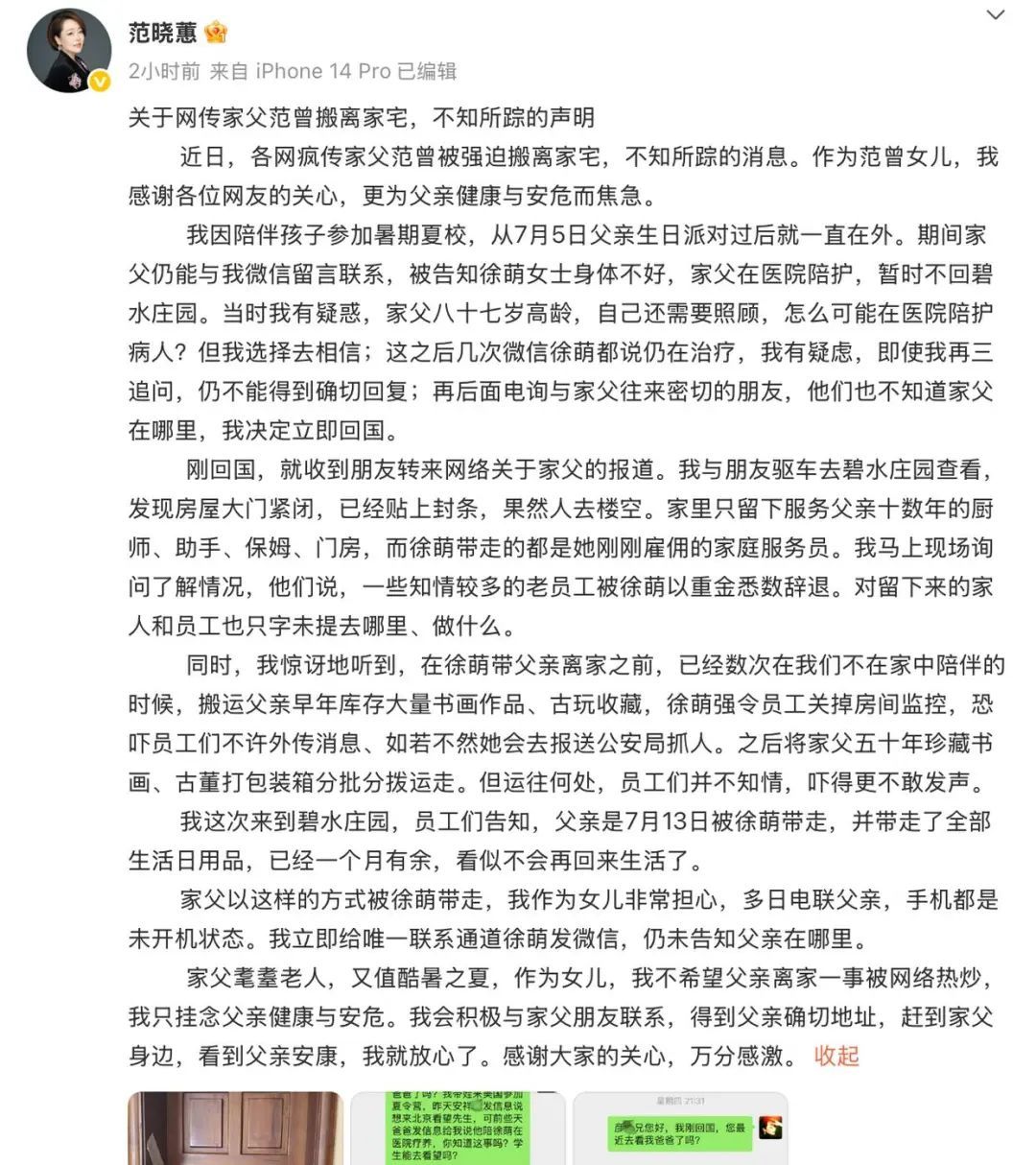 8月16日,微博认证信息为国家京剧院一级服装设计,文化部青联委员@范晓蕙发文回应此前网络关于“87岁书画大师范曾被37岁妻子控制,20亿藏品搬空”传闻,同时贴出与多位友人微信联系聊天截图。回应全文如下: